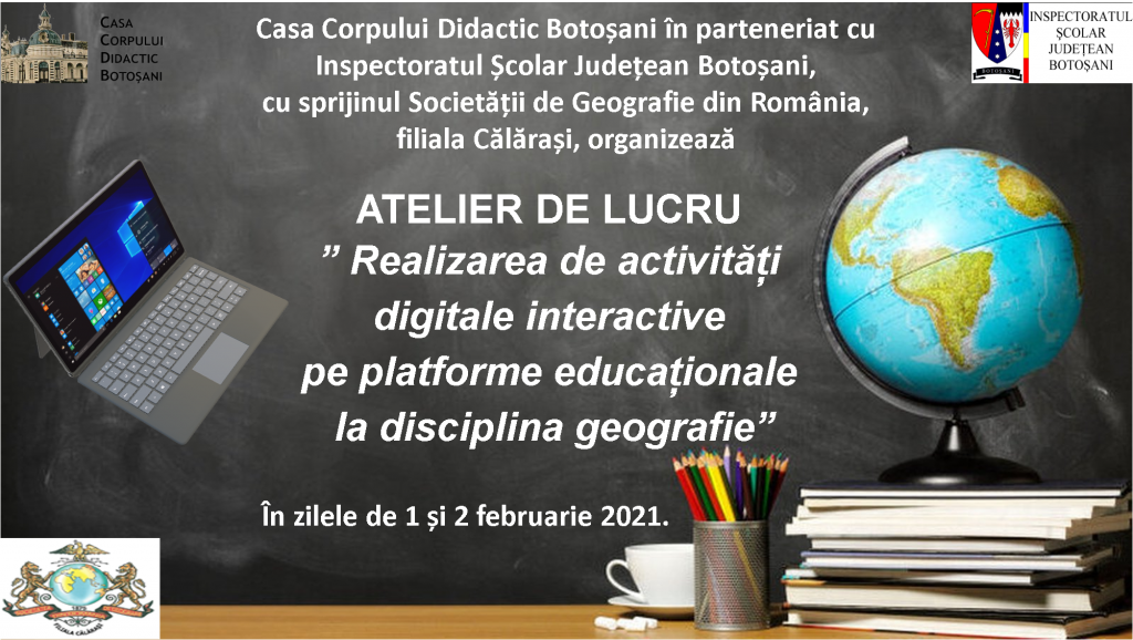 Atelierul de lucru ,,Realizarea de activități digitale interactive pe platforme educaționale la disciplina geografie,, Scopul. Sprijinirea profesorilor de geografie în dobândirea/perfecționarea unor abilități de folosire... Continue reading